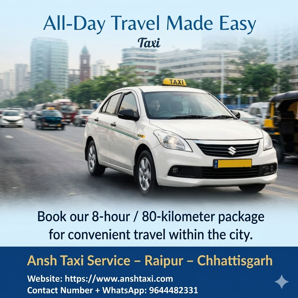 Local city taxi (Raipur Local) – For sightseeing within the city, meetings, or shopping